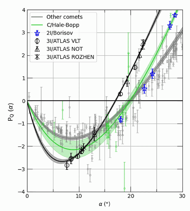 Исследование, опубликованное на этой неделе на сервере препринтов arXiv, сообщает, что этот межзвёздный захватчик демонстрирует чрезвычайно глубокую отрицательную поляризацию –2,77% при фазовом угле 6,41 градуса.
