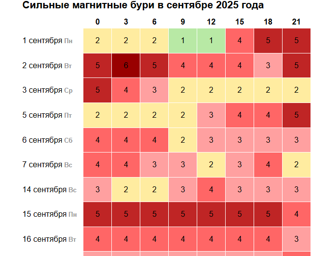 Прогноз магнитных бурь на 14, 15 и 16 сентября 2025 года: