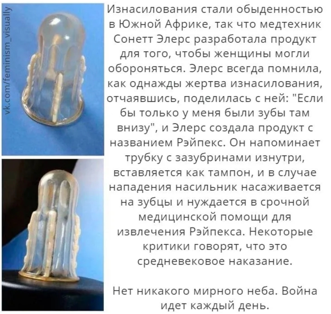 Женщины вынуждены защищаться, и как средство защиты предлагается разное, от шипованного женского презерватива до пружинок. В любом случае, при попытке изнасилования, мужчина получит травму своего полового органа и будет вынужден обратиться к медикам.