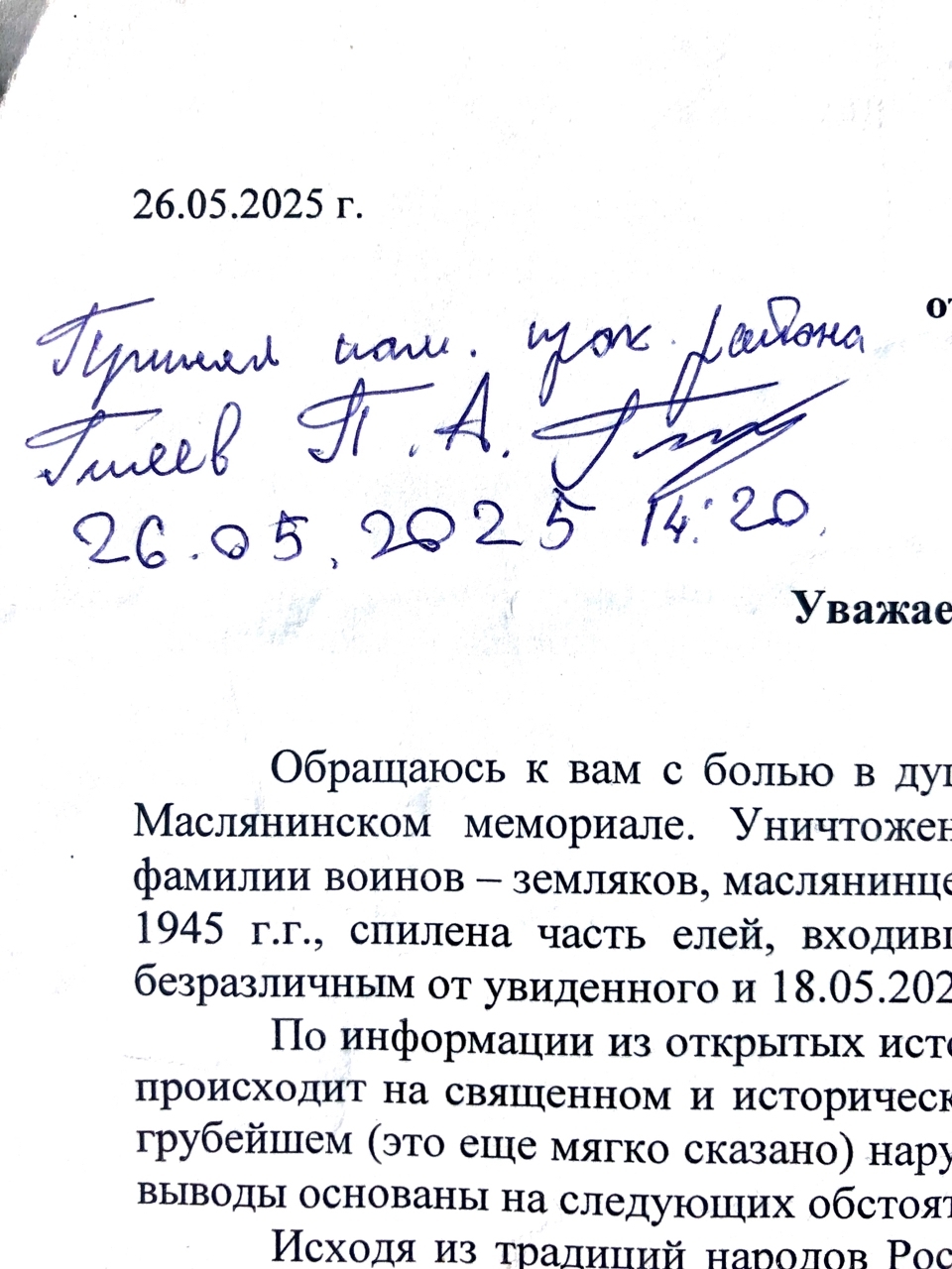 17 мая 2025 года был установлен факт разрушения мемориальной стены с фамилиями погибших героев – земляков в годы Великой Отечественной войны 1941 – 1945 г.г. Не мог пройти мимо этого вопиющего случая. С этого момента началась моя борьба по защите Памяти и сохранению первоначального облика Маслянинского мемориала. Спустя четыре месяца окончательно понимаю, что столкнулся с бюрократическими трудностями и мне, как юристу неприятно, что исходят они от прокуратуры и носят системный характер.