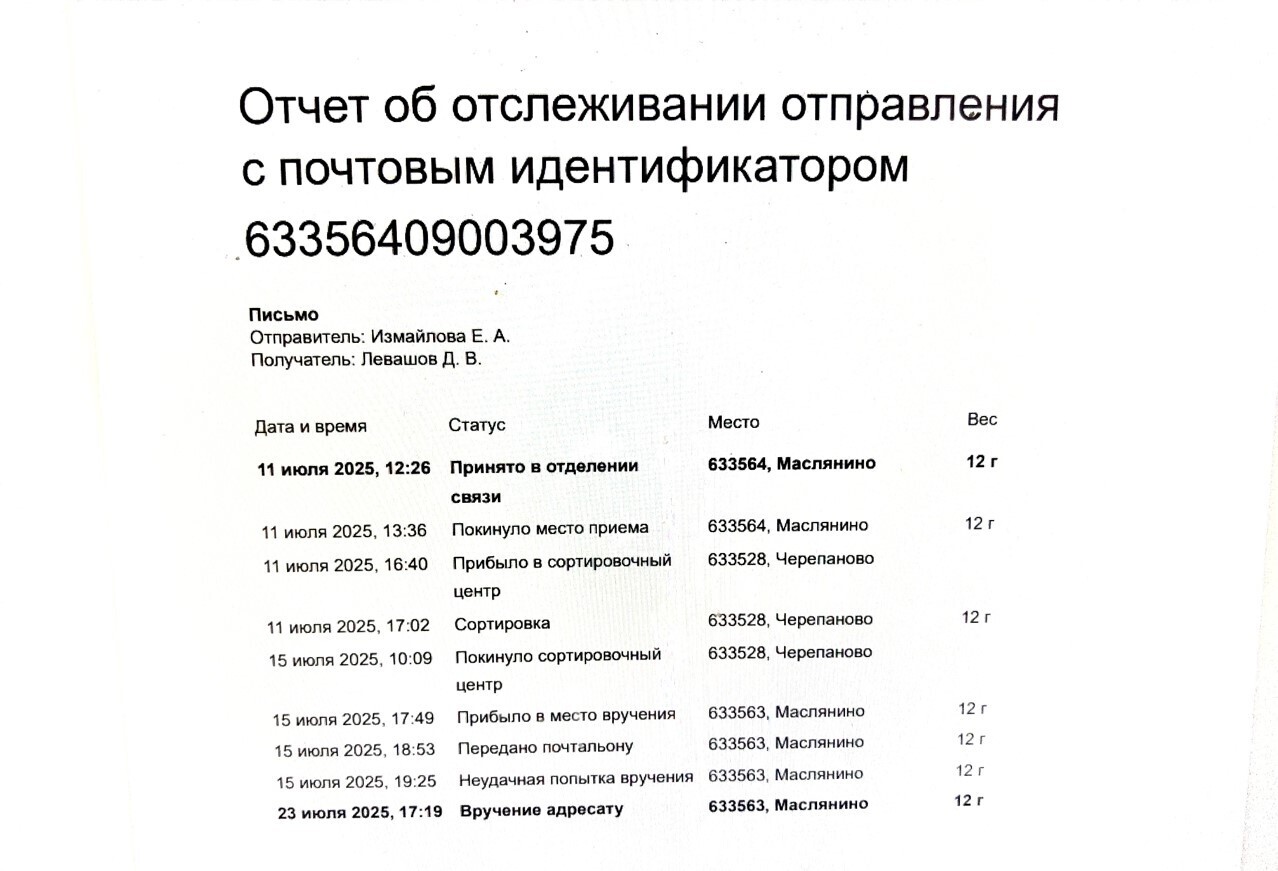 Отправителем письма почему-то является физическое лицо, которое 16 дней (с 26 июня по 11 июня 2025) находилось в экспедиции на почту.