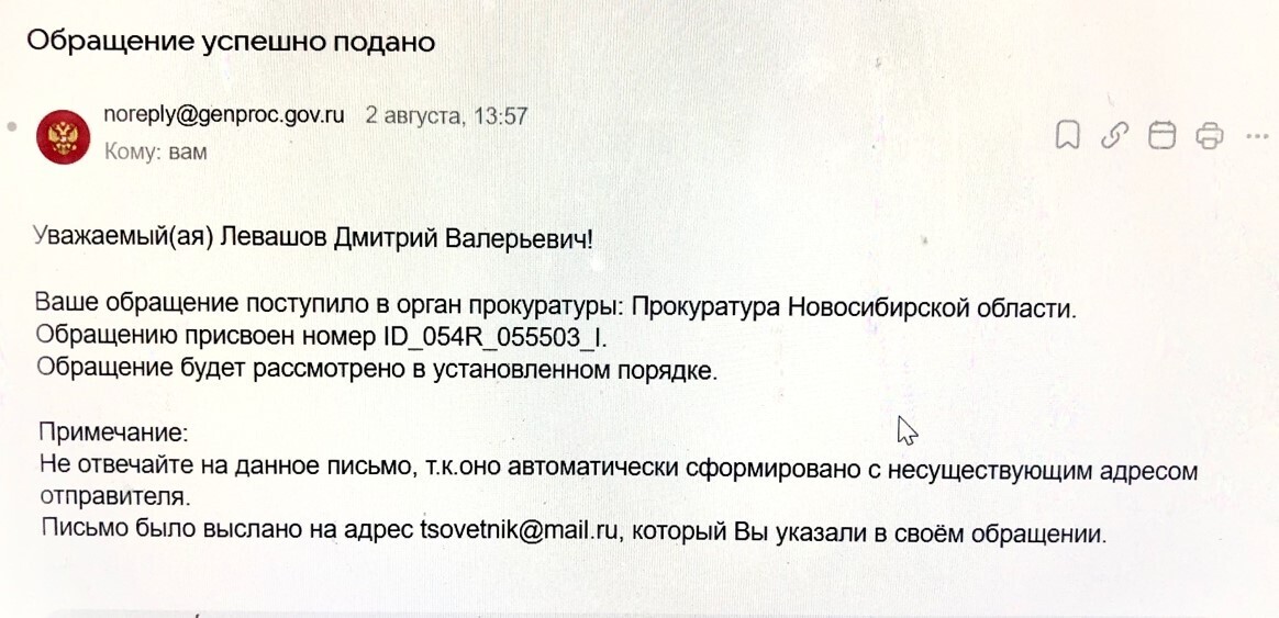 02.08.2025 – подана жалоба в прокуратуру Новосибирской области на решение прокуратуры Маслянинского района, в электронной форме через Госуслуги.
