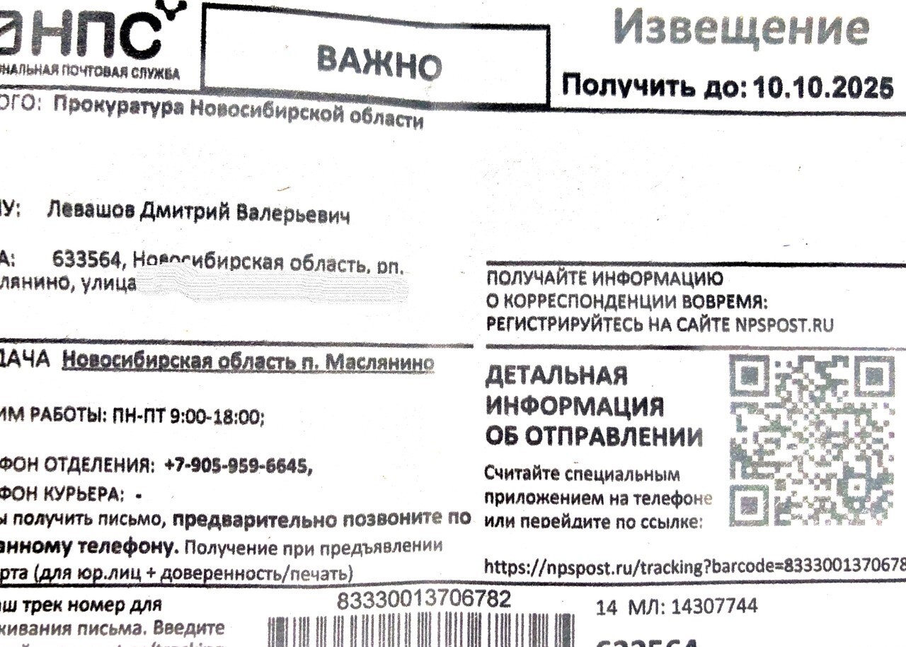 14.09.2025 – в дверях обнаружил (а если бы не обнаружил?) извещение от Национальной почтовой службы о почтовом отправлении Прокуратуры Новосибирской области. По всей видимости, это тот самый ответ. На электронную почту ничего не приходило.