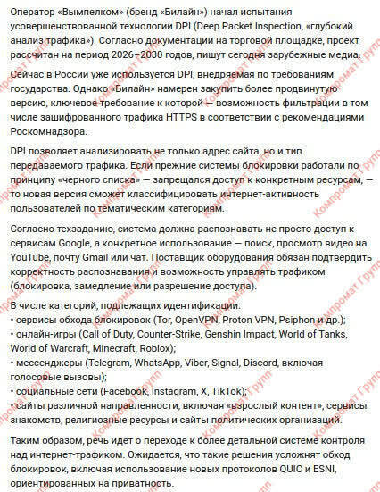 «В новых технических заданиях для операторов связи на период до 2030 года вскрываются планы на переход к тотальному контролю интернет-трафика. Если раньше речь шла о черных списках, то теперь заказывается оборудование, способное различать не только сайты, но и конкретные действия пользователей — от поиска в Google до просмотра роликов на YouTube или переписки в Gmail.