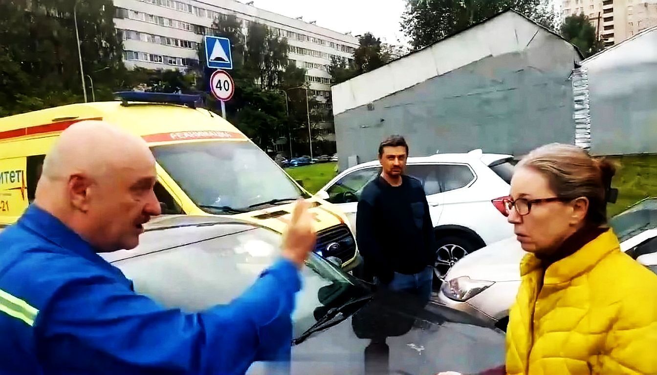 Вместо того, чтобы быстро дать заднюю и освободить проезд машине с включенными мигалками, чванливая дама вышла наружу и начала доказывать свою правоту и значимость.