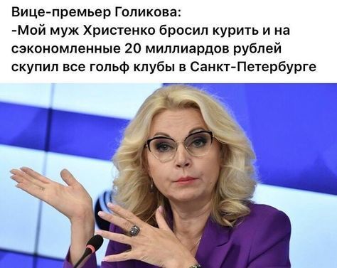 С таким состоянием спокойно можно каждый день приходить на работу в новых тряпках по 10 лимонов рублей. Хотя работой это назвать трудно, долларовый мультимиллионер "работает" по.. вопросам нищеты населения. Вот по этому оно и нищее, по причины наличия Голиковой. Кроме распила на Кремлёвской вакцинной жижице, у Голиковой есть патент на абсолютно бесполезный препарат за дикие деньги- "Арбидол", за что она получила прозвище "мадам Арбидол".