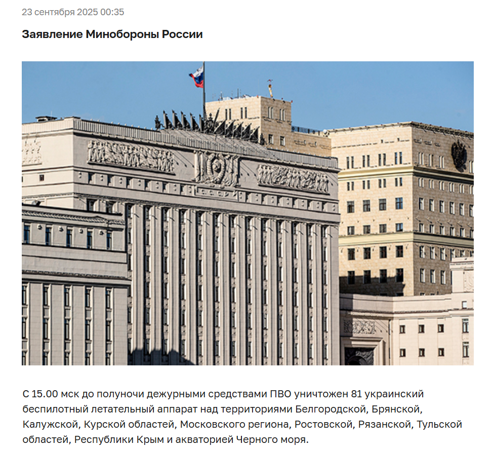 Вечером 22 сентября враг начал атаку на Московский регион. Мэр Москвы Сергей Собянин оперативно размещал сведения о сбитых БПЛА в своём Telegram-канале и в мессенджере МАХ. Первое его сообщение было опубликовано в 19.30, последнее — уже ночью, в 02.40, после того, как сбили ещё два беспилотника.