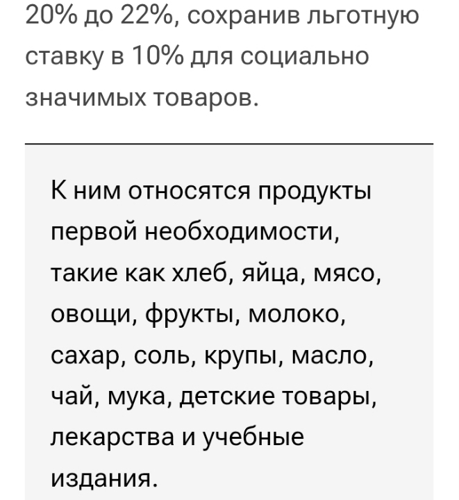 Мы НДС не видим. Он в любом случае в розничной цене. А "энта" самая розничная ползёт и ползёт вверх. И если НДС так и остаётся 10%, значит внутри "откусывают" больше для себя бедненьких. А нам что? Вошел в магаз. Было 70 руб., стало 75 руб. А до НДСа мне нет никакого дела.