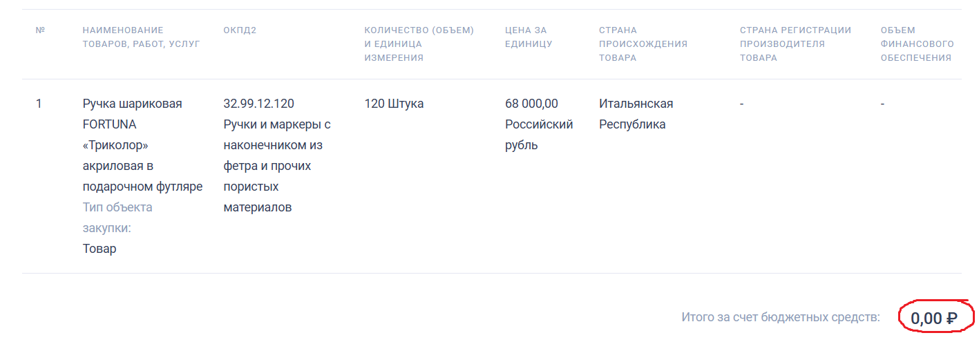 Правда, есть одна странность. На портале госзакупок в графе «Итого за счёт бюджетных средств» стоят нули. За счёт каких тогда средств приобретён товар, и почему именно на портале госзакупок он фигурирует?