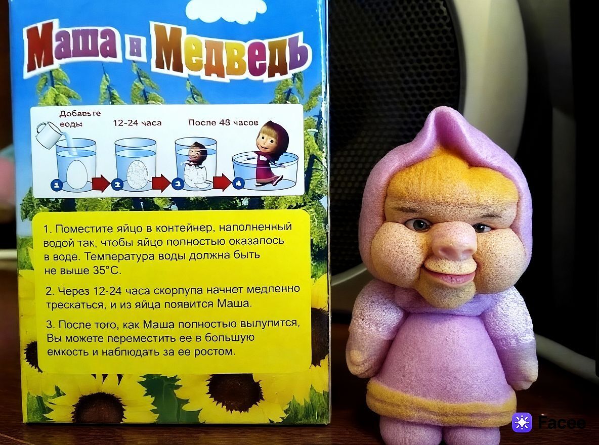 А вот какой уникальный ход предприняли мастера игрушечного дела, предложив детишкам Машу в яйце, которое при помещении в воду, начинает трескаться и из него вылупляется девочка, увеличивающаяся в размерах.