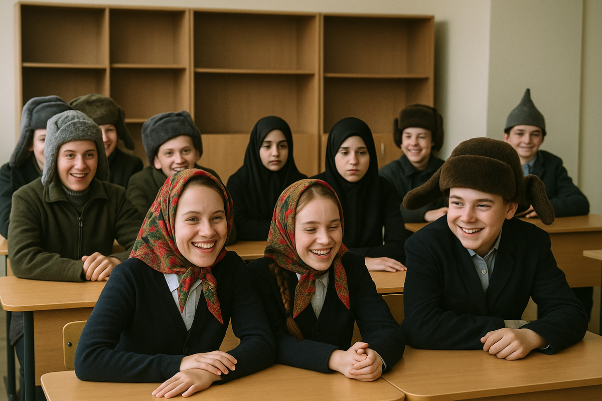 «А почему им можно, а нам нельзя?»: русские дети в знак протеста против хиджабов пришли в школу в шапках-ушанках.