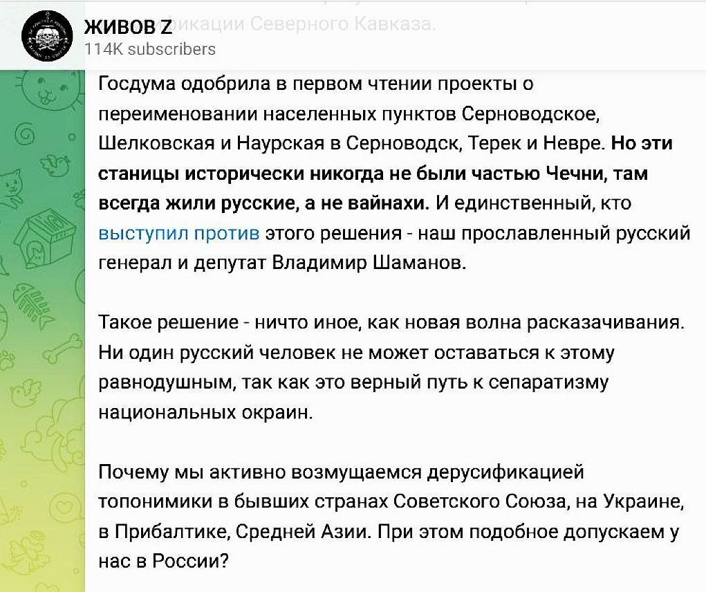 Чеченцы переименовывают русские населённые пункты — это показательное проявление неуважения к русским.