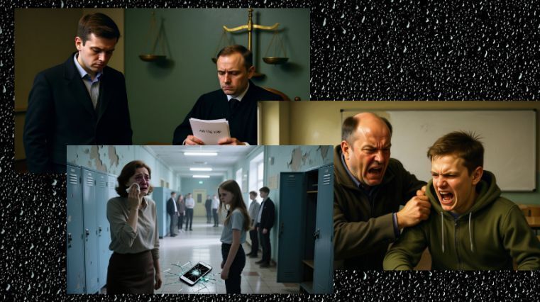 Молодой учитель физики (26 лет) пытается навести порядок на уроке. Два восьмиклассника громко разговаривают, игнорируют замечания. В порыве эмоций учитель бросает ручку — она задевает одного из них.