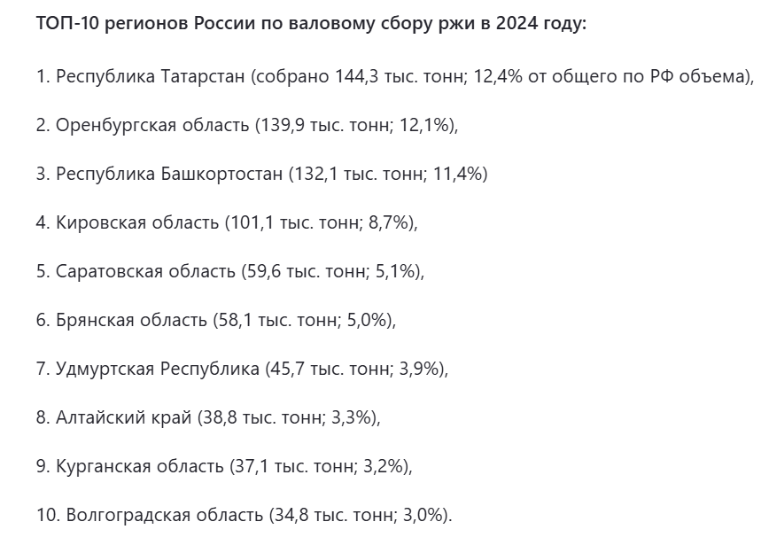 Понятия не имею. Но вот в этих регионах пока, наверное, особых проблем с ржаным хлебом не будет. А как дальше будет, кто его знает... Хотя объём сбора сократился за эти годы. Не хотят рожь сеять.