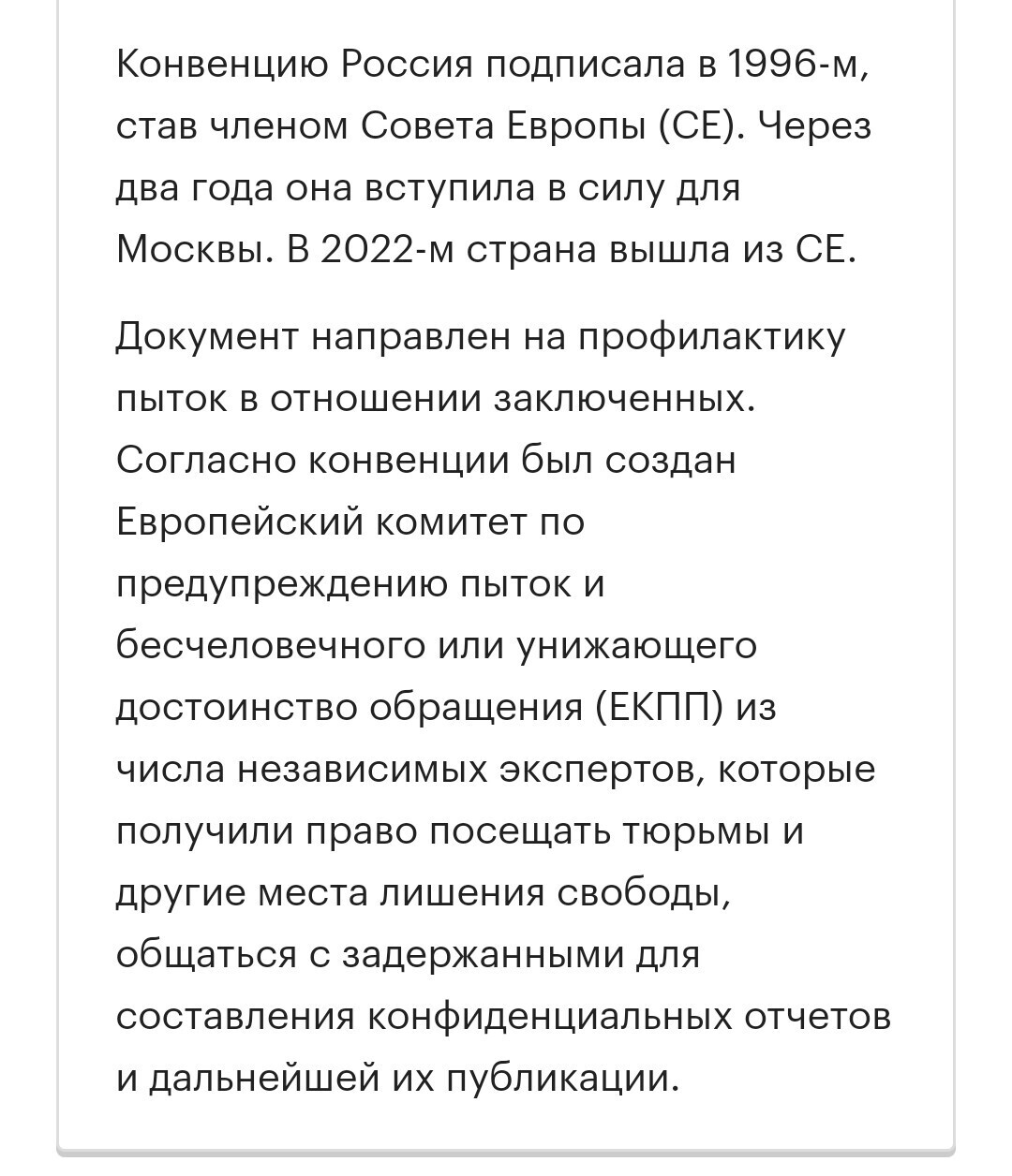 Суть в том, что Россия с 2023 года уже не участвует в работе этой конвенции из-за того, что Европейский совет отказался участвовать в её обновлении и блокировал выбор нового российского представителя. Несмотря на то, что конвенция призвана защищать людей от пыток и жестокого обращения в местах заключения, Россия решила прекратить своё участие.