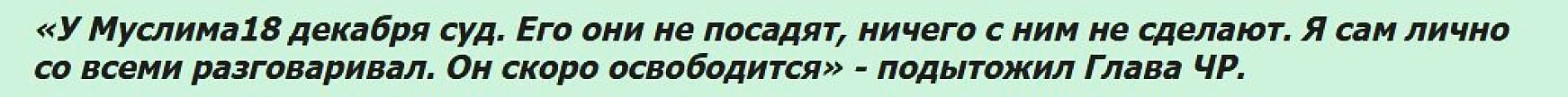Так же прозвучит очень тяжеловесное заявлении уполномоченного по правам человека Чечни Мансура Солтаева о невиновности Муслима ни в одном эпизоде. Защита серьёзных и родных людей, почему-то не помогла и всё закончилось реальным лишением свободы.