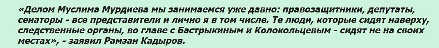 Всемогущий и влиятельный Рамзан Кадыров заявил, что Бастрыкин Колокольцев «сидят не на своих местах», «беспредельничают, сидя в креслах» и их за это обязательно накажет Всевышний. Рамзан Ахматович ещё и авторитетно пообещал, что Муслима «они не посадят» и «он скоро освободится».