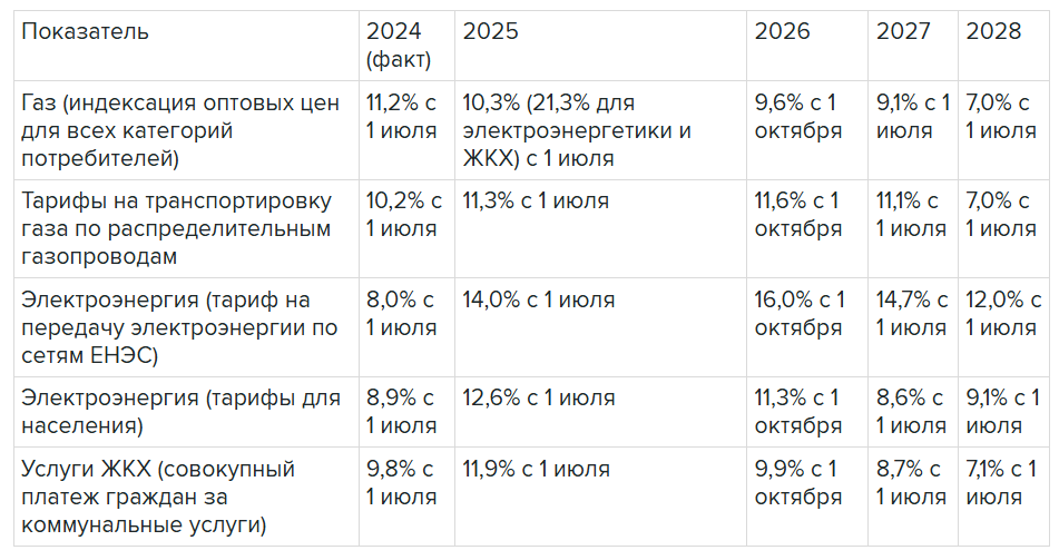 Об этом сообщает агентство «Интерфакс». Они же разместили и вот эти данные: прогнозируемые темпы индексации тарифов в 2026-2028 г.г.