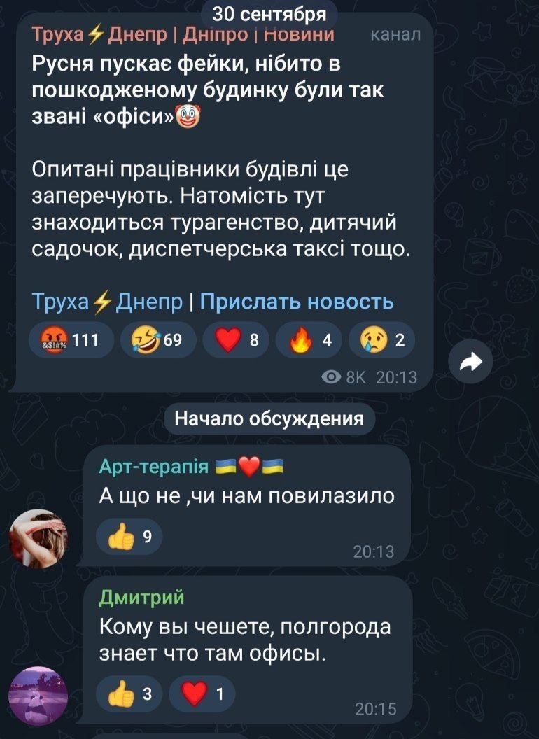 И началась неразбериха! Сначала «украинские помойки» (пардон, паблики) сообщили, что дроны попали в офисный центр, затем «офисный центр» превратился в «архитектурный университет». В общем, удар по офисам хотели преподнести как поражение гражданской инфраструктуры. Но не получилось. Все их «грандиозные» планы нарушили местные жители в соцсетях, которые в комментариях начали писать крамольные вещи: