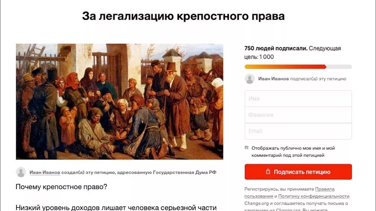 Интересно, а сколько крепостных рассчитывает получить автор этой инициативы за то, что её огласил?