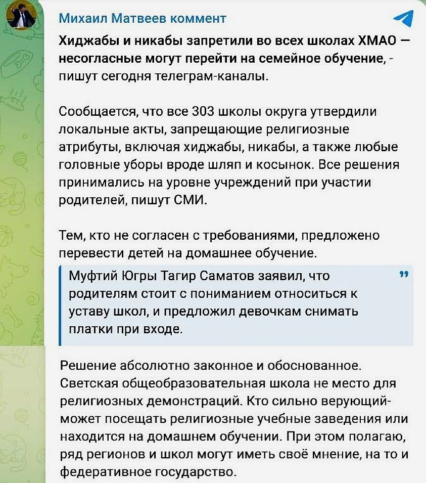 Депутат Государственной Думы Михаил Матвеев в своём телеграм-канале назвал это решение абсолютно законным и обоснованным и рассказал, что Муфтий Югры Тагир Саматов посоветовал родителям с пониманием отнестись к новой реальности, а девочкам снимать платки при входе в школу.