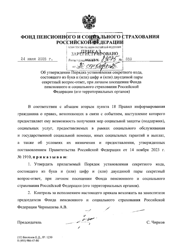 "За установлением секретного кода необходимо лично посетить территориальный отдел социального фонда и написать соответствующее заявление"