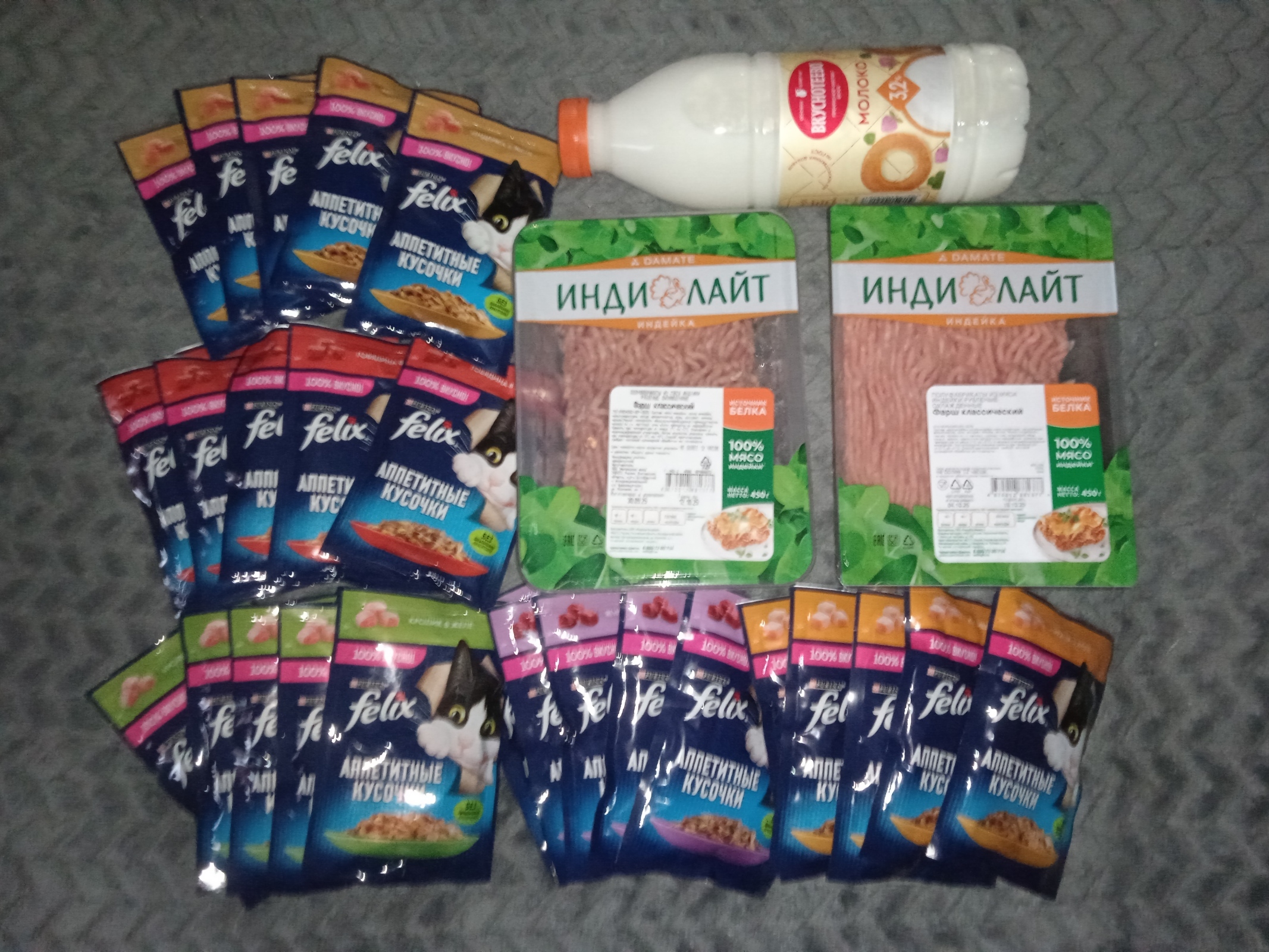Итак,друзья, как можно увидеть на фото выше, я сегодня заказала две упаковки фарша "Индилайт", молоко "Вкуснотеево" и 25 пакетиков корма "Феликс" для своих хвостиков...