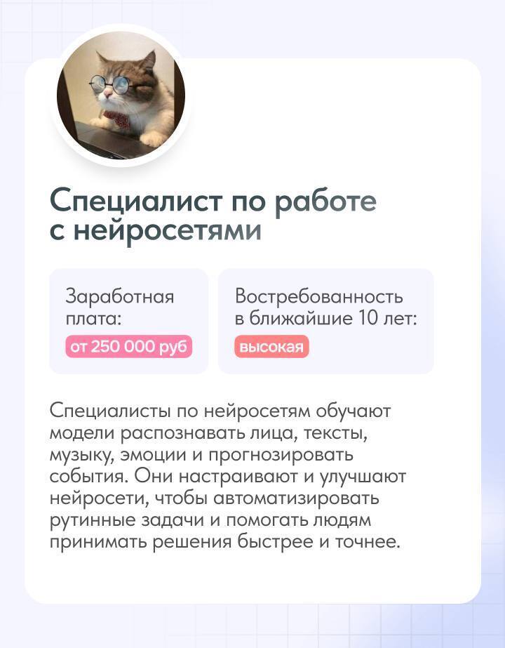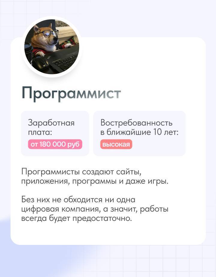 Шамиль Ахмадуллин (педагог, психолог, коуч...) подготовил подробные карточки на те профессии, которые будут востребованы через 5-10 лет. Конечно преимущество за ИТ-сферой, а какие именно направления профессиональных компетенций можно посмотреть в карточках.