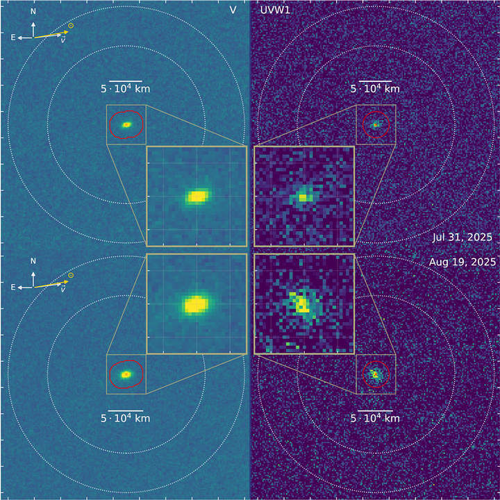 Что делает 3I/ATLAS таким удивительным, так это место, где происходит эта активность. Наблюдения Swift обнаружили гидроксил, когда комета находилась почти в три раза дальше от Земли до Солнца. На таком расстоянии водяной лёд на поверхности кометы не должен легко сублимироваться (переходить из твёрдого состояния в газообразное).