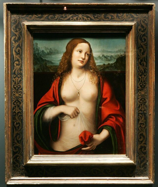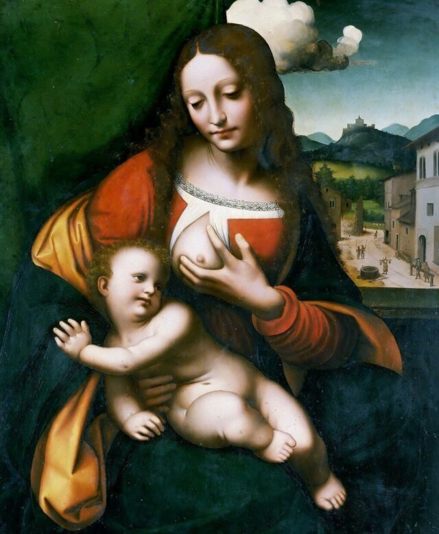 Причем если Барнаба да Модена в XIV веке написал в своей «Мадонне с Младенцем» (1370/75) часть груди с соском плоскостно, то эрмитажная «Мадонна Литта» (ок. 1490) Леонардо да Винчи (1452–1519) показывает правую грудь
