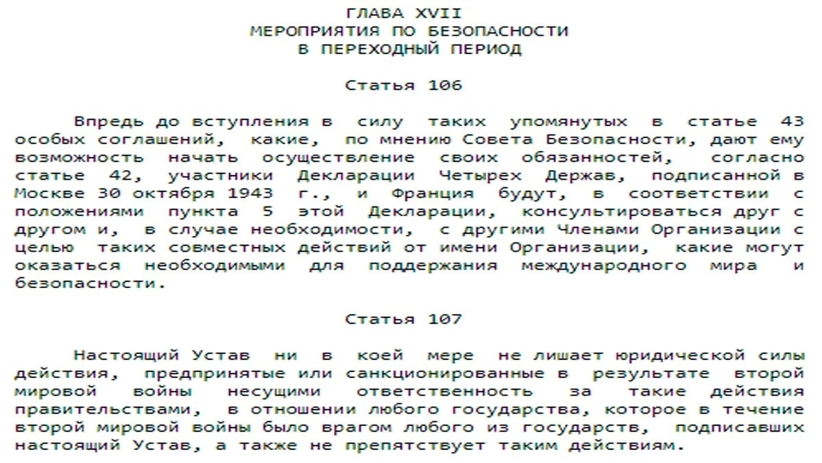 Статьи 106 и 107 Устава ООН не содержит ту информацию, которая отражена в последнем скриншоте. Она ложная от слова "совсем" и вводит читателей в заблуждение. Предлагаю ее удалить либо автором публикации либо пользователем сайта, который разместил этот информационный фейк.