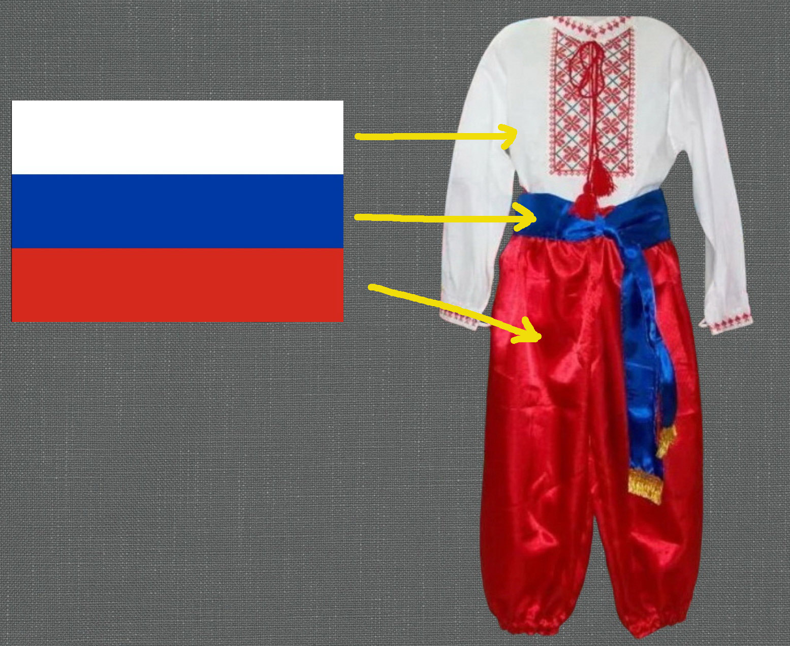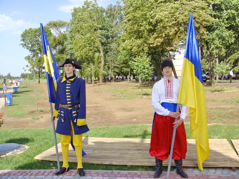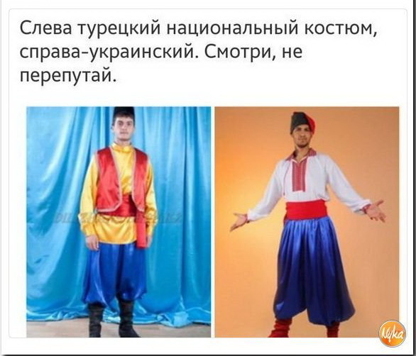То це национальная одежда вукраинцев. Почему она имеет стиль турков но цвет флага Петра I? Жовто бакитный флаг рогульской Вукарины -цвет портков и кафтана шведской армии Карла XII. Драбанты- гвардия Карла, имели пояса жовто бакитного цвета. Казачки Мазепы которые служили Карлу снимали с убитых солдат эти пояса и резали на куски, надевали на пики что бы обозначить своих- так появился флаг Украины!