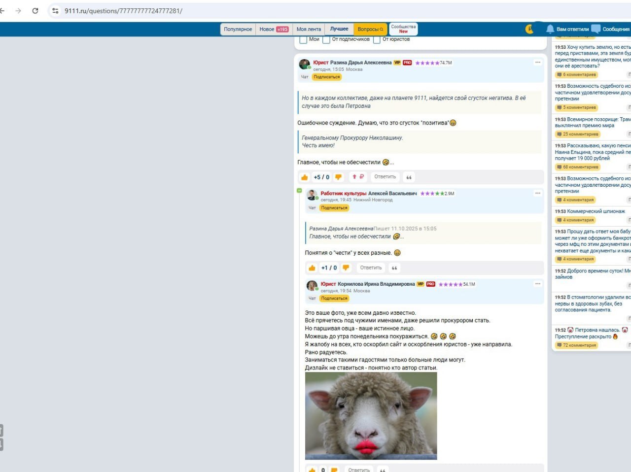 "Наша прокурорша — это бывшая овца. Могу скрины прислать. Её на сайте зовут мадам — мразина. Очень популярна среди читателей".