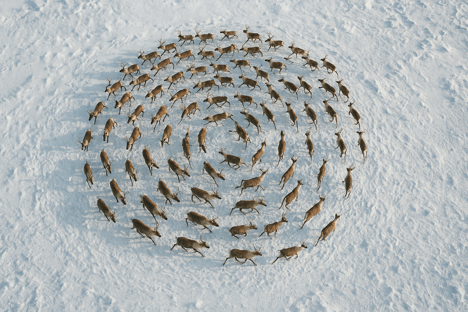 Пастух идёт сбоку, подаёт голос, и вот уже сотня оленей послушно вращается.