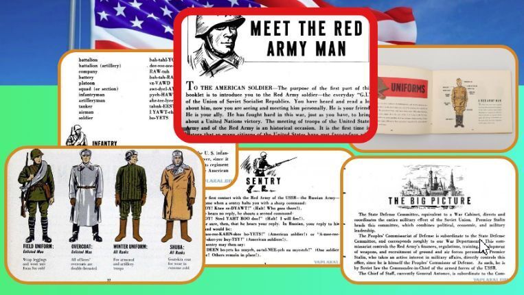 У них даже была секретная брошюра под грифом «ТОЛЬКО ДЛЯ ВОЕННОГО ПЕРСОНАЛА», выпущенная 23 апреля 1945 года в Вашингтоне. По сути, это инструкция: «Как общаться с красноармейцем, чтобы он не пристрелил вас с первого слова». Объем - 77 страниц с картинками и текстом, набранным крупным шрифтом.