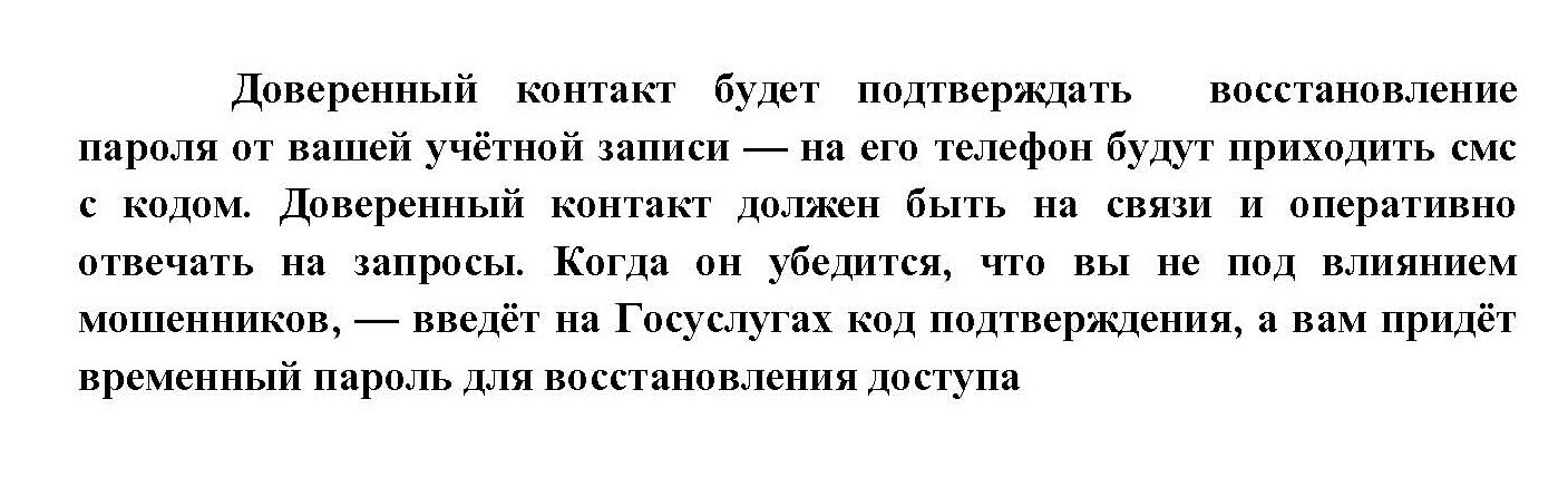 Доверенный контакт не будет иметь доступ к вашему личному кабинету и не сможет выполнять действия от вашего имени