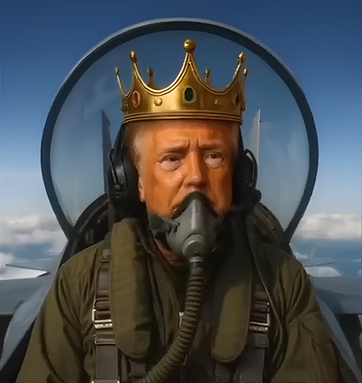 В соцсети Truth Social появился видеоролик, где Трамп в короне пилотирует реактивный истребитель с надписью «KING TRUMP» и сбрасывает на толпу протестующих коричневую жидкость. Похожую... на... В общем, на оно самое.