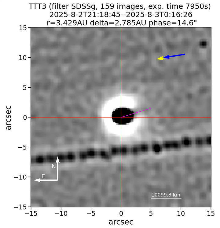 Это наблюдение, противоречащее известному поведению всех комет, было получено 2 августа 2025 года двухметровым телескопом-близнецом (TtT) в обсерватории Тейде, Испания.