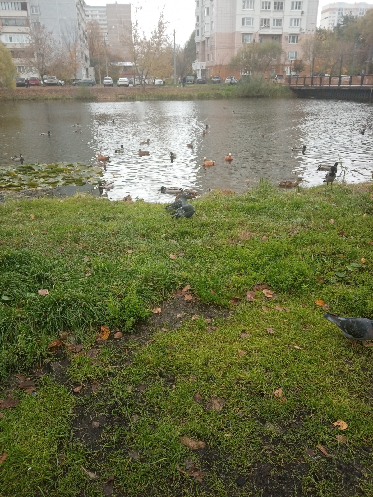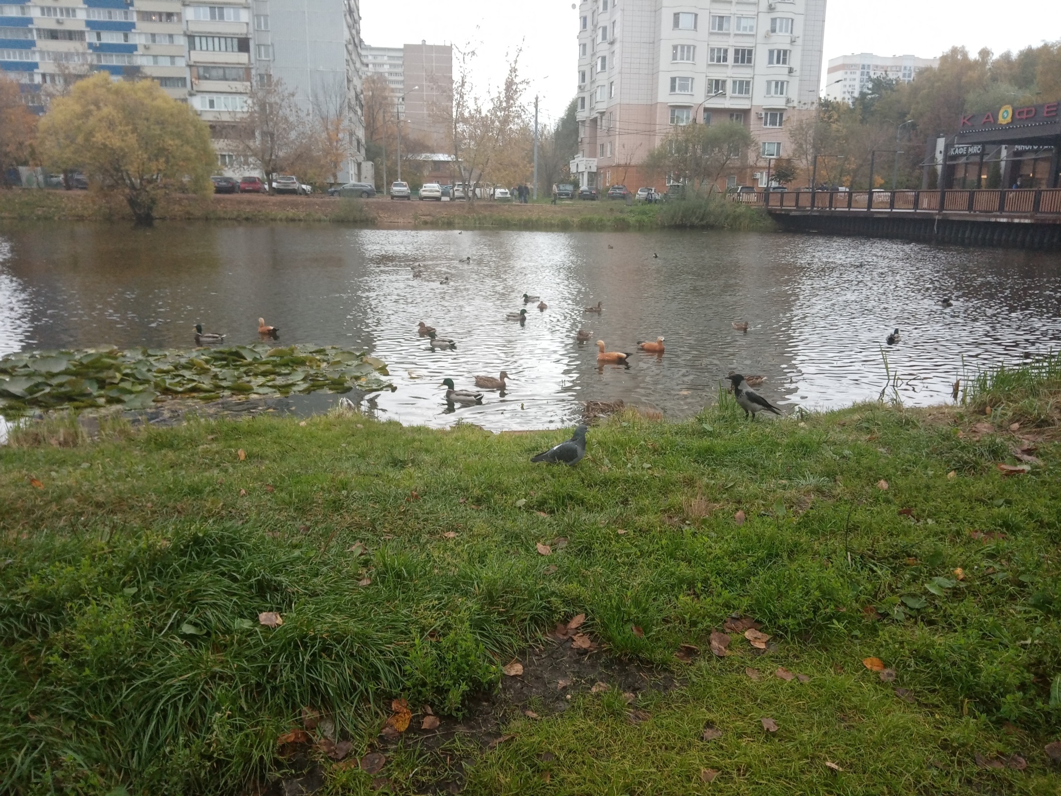 Между домами небольшой водоём с утками и голубями. И ещё одна важная ворона прилетает. Каждое утро нас ждут. Знают, что мы приносим хлебушек и крупу, чтобы их покормить.