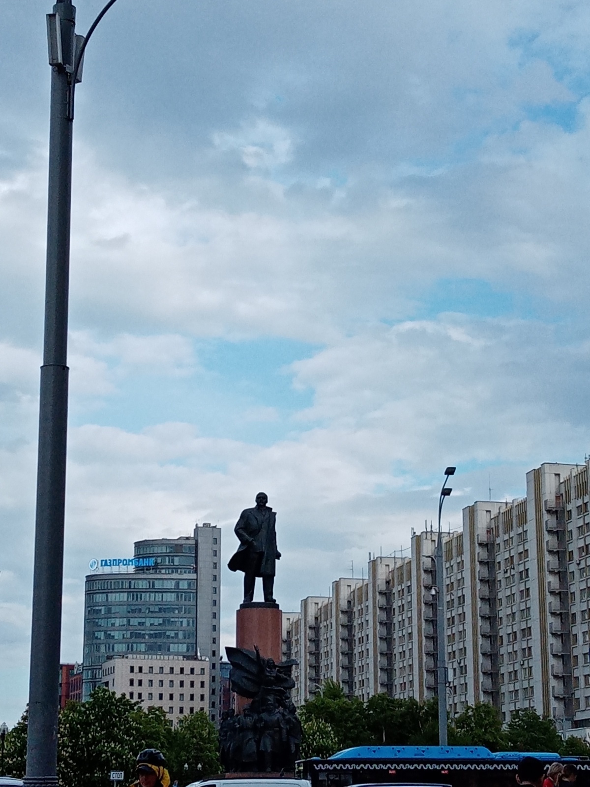 С одной стороны памятник, с другой высотные здания.