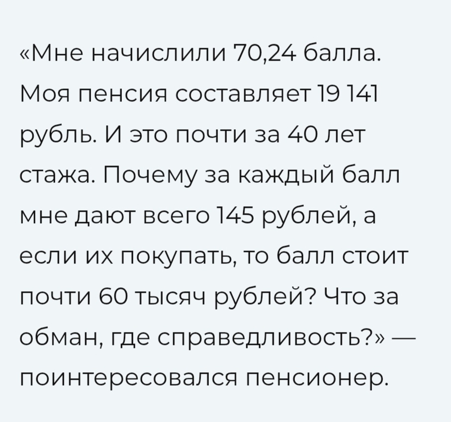 Пенсионный балл начисляют за 145 руб., а продают за 60 000: разницу в стоимости одного пенсионного балла посчитали обманом