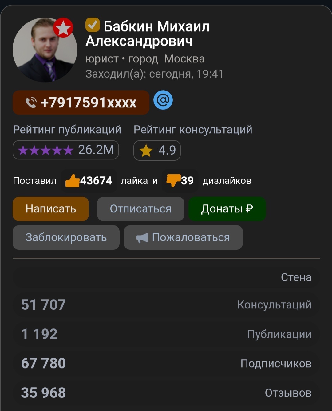 Первое условие - это действующий участник сайта; Второе - у него должно быть не менее 10000 (десяти тысяч) консультаций; Третье - рейтинг не ниже 4,8 (четыре целых восемь десятых). Четвёртое - ересь не пишет от себя в консультации (бесплатной/платной). Если что есть дополнить по этому поводу. То делитесь в комментарии, в личных сообщениях. За образец беру анкету юриста Бабкина Михаила Александровича. Он соответствут требованиям вышеизложенным: действующий юрист, 51707 консультаций, рейтинг 4,9 и ересь на сколько я знаю в консультациях не пишет. Порядка двенадцати человек я присмотрел. Правда из них я половину более-менее знаю. В их число входят юристы: Працко, Разина, Усольцев, Кадыров, Сиротин, Турчин, Берестов, Зотов, Чистяков, Искибаева ну и само собой Бабкин. Сюда бы ещё включил Бычкову включил хоть у ней и 4,79 зато аж 120566 консультаций.
