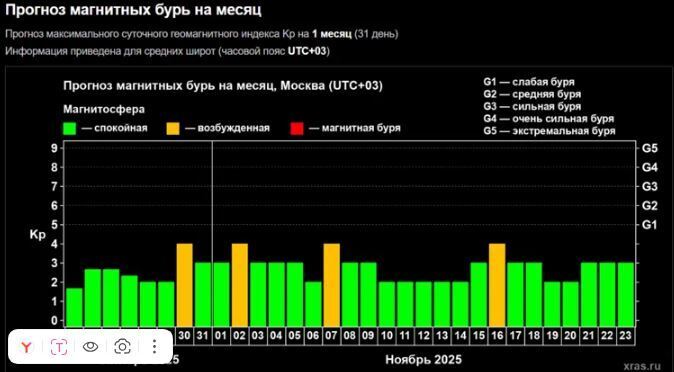 26 октября: Пик магнитной активности. Прогнозируется сильная магнитная буря (G3). Возможны более серьезные нарушения работы энергосистем, спутниковой связи и навигации. Также может наблюдаться увеличение полярных сияний в более низких широтах.