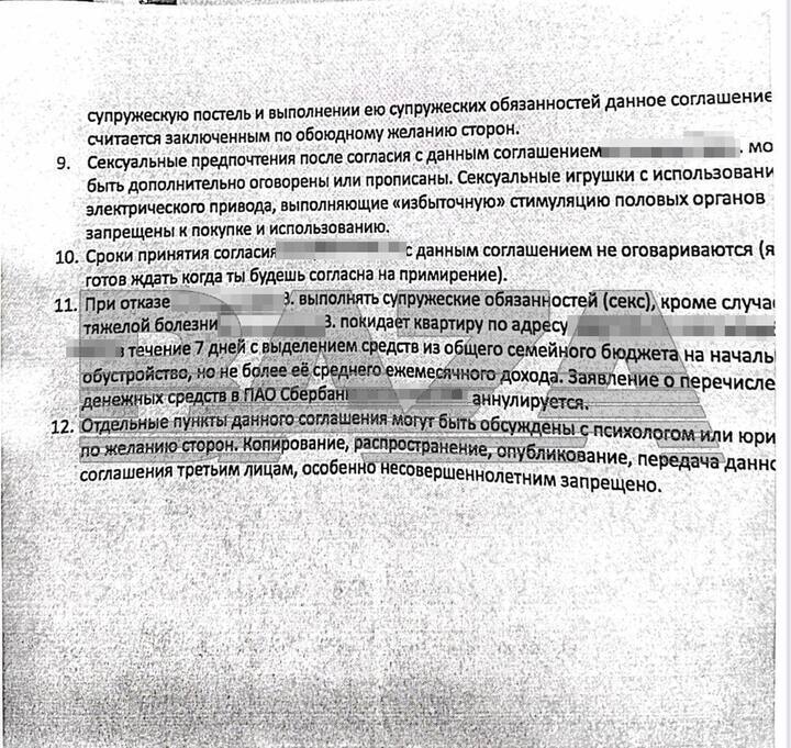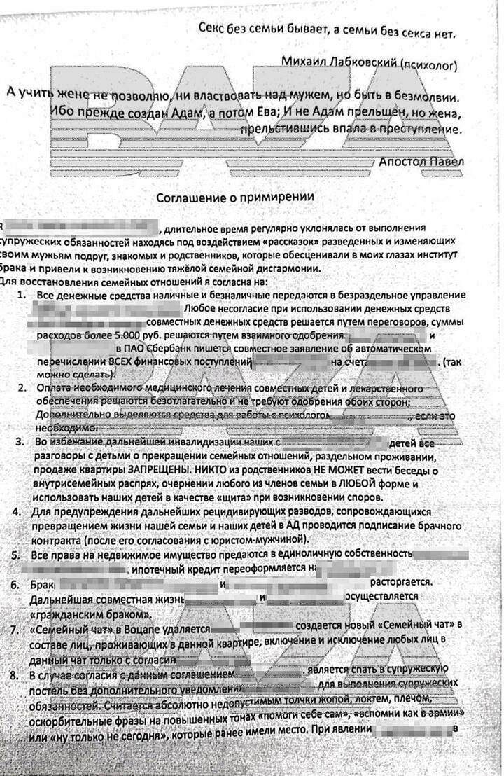 Женщина должна была согласовывать с мужем все траты свыше 5 тысяч рублей. Ей также предписывалось передать мужу контроль над семейным чатом и по первому требованию выполнять супружеский долг. В случае отказа от последнего она должна была покинуть квартиру в течение семи дней.