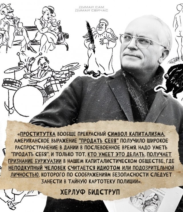 «Проститутка вообще прекрасный символ капитализма. Американское выражение "продать себя" получило широкое распространение в Дании в послевоенное время. Надо уметь "продать себя", и только тот, кто умеет это делать, получает признание буржуазии в нашем капиталистическом обществе, где неподкупный человек считается идиотом или подозрительной личностью, которого по соображениям безопасности следует занести в тайную картотеку полиции».
