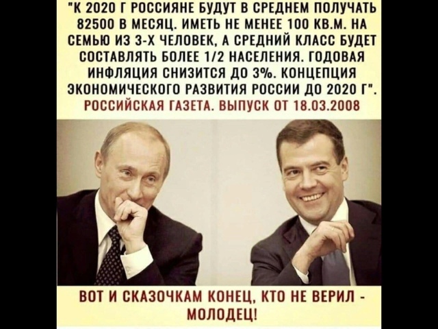 6. К 2015-2020 году вывести в Россию в пятёрку стран лидеров по ВВП по по паритету покупательной способности; сделать Россию самой привлекательной для жизни страной; обеспечить независимость экономики от цен на нефть; повысить долю среднего класса до 60-70% населения (2008). Уже идёт 2021 год - ничего из этого так и не выполнено.