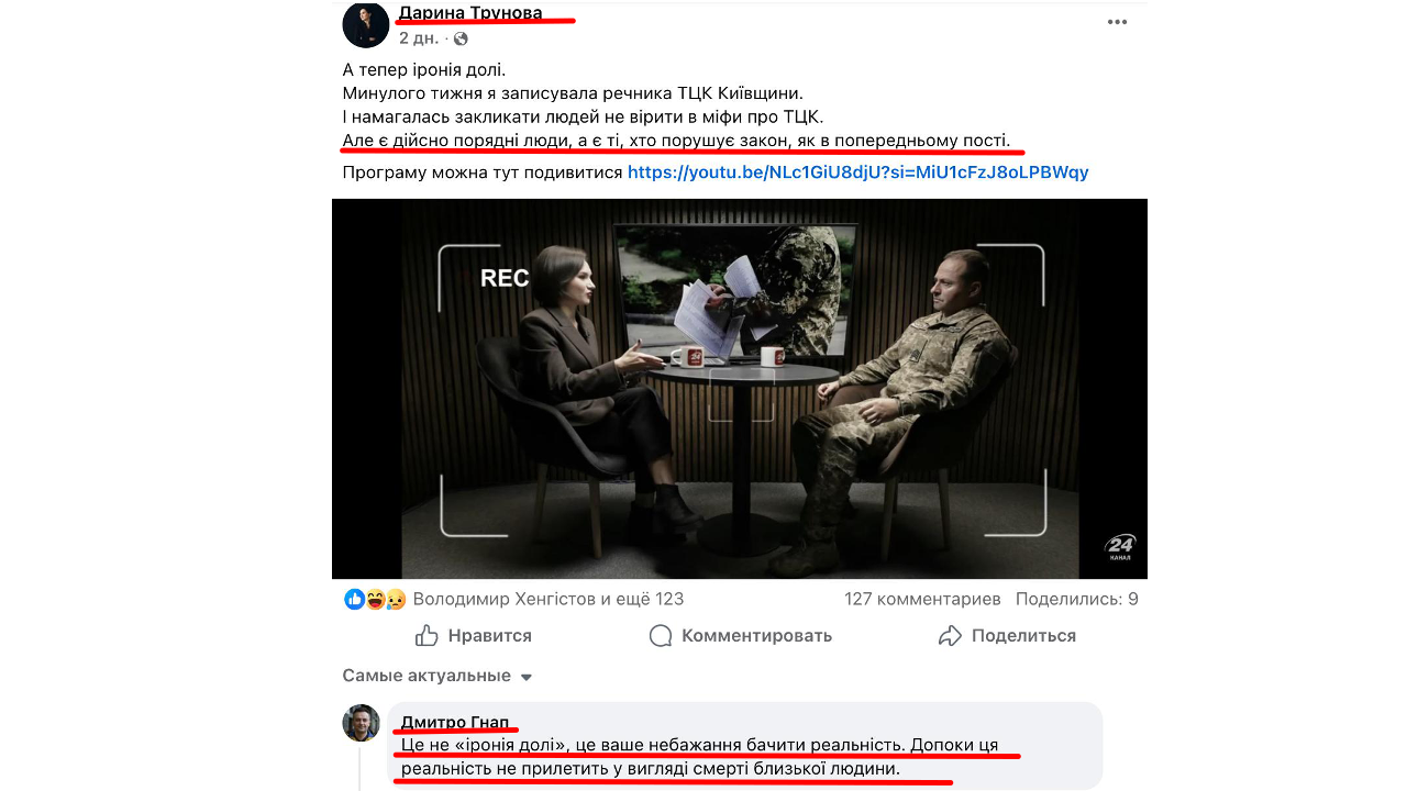 Речь идёт об украинской журналистке Дарине Труновой, которая известна на Украине как журналистка, призывающая украинцев не верить в жёсткость ТЦК (аналог военкомата в России) и записываться в добровольцы.