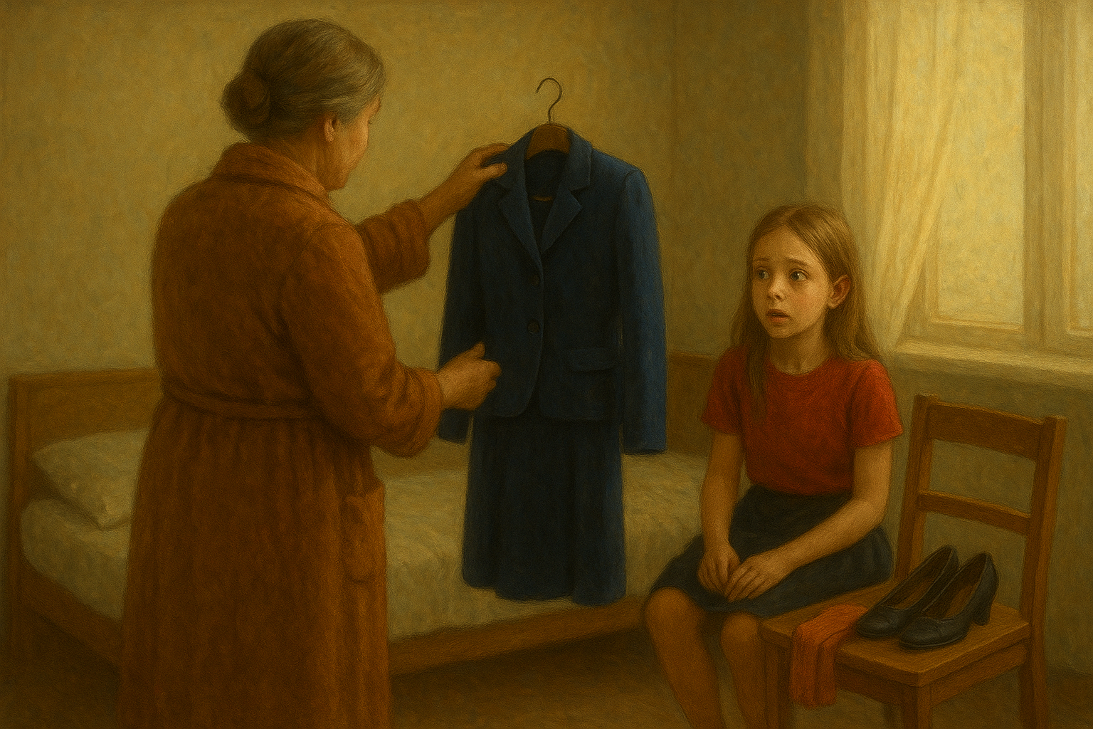 В развернувшемся пакете взору Лизы предстал ансамбль, от которого у ребёнка по коже пробежали мурашки: кримпленовый синий костюм (пиджак с юбкой-карандашом), рыжие х/б колготки, ослепительно белый платочек и пара лакированных чёрных туфель.