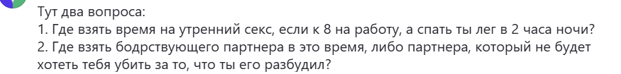 Имеется ввиду - только проснулся и сразу за секс, ненавижу секс с нечищенными зубами, как своими, так и зубами партнера. Поэтому секс по утру мне не подходит, а вот часа через 2-3 в самый раз.