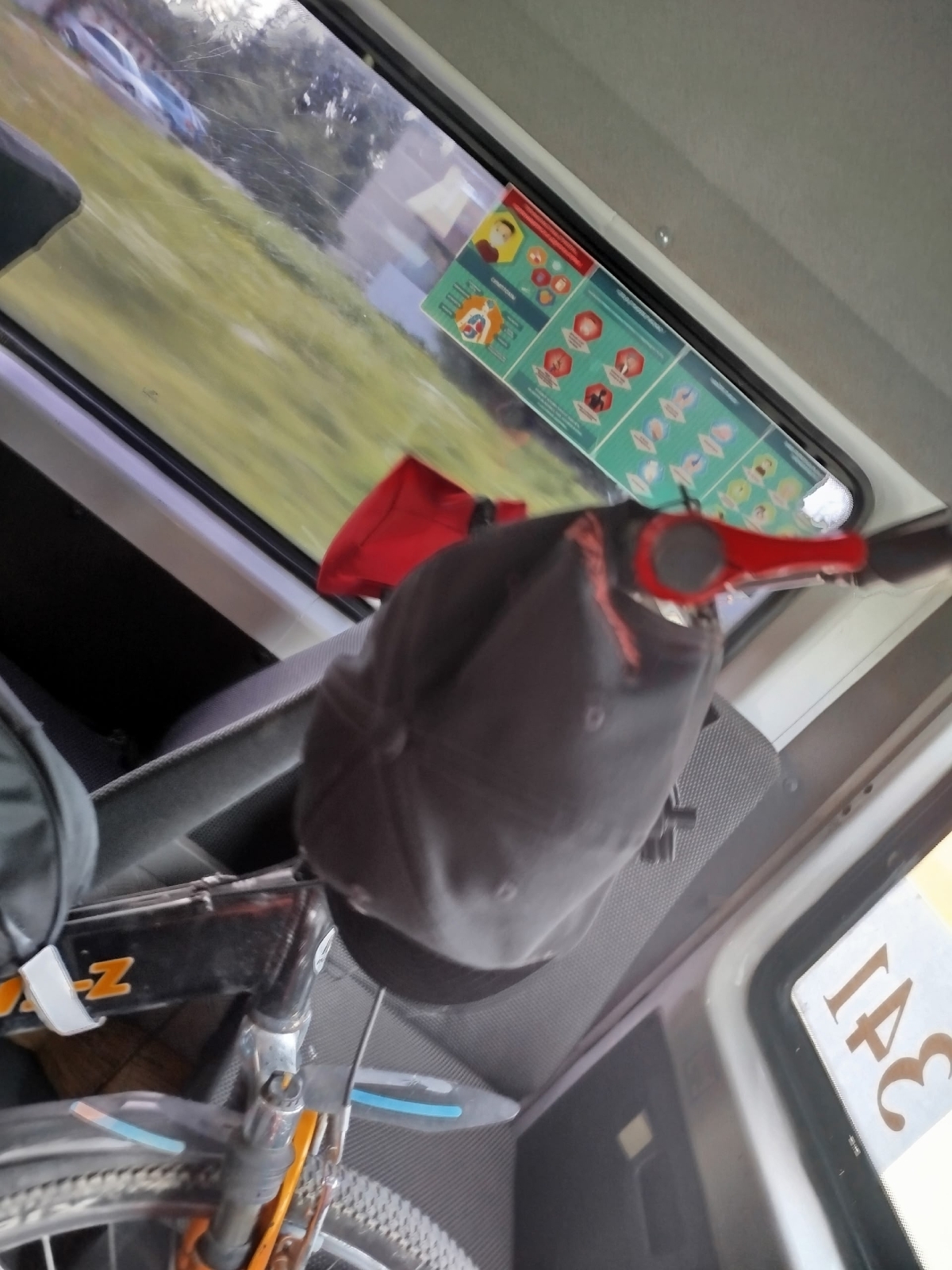 Вот так мы и катились. Повезло, что было мало людей. Если бы маршрутка была полной, мне бы отказали. Велосипед занимает 3 места в проходе.